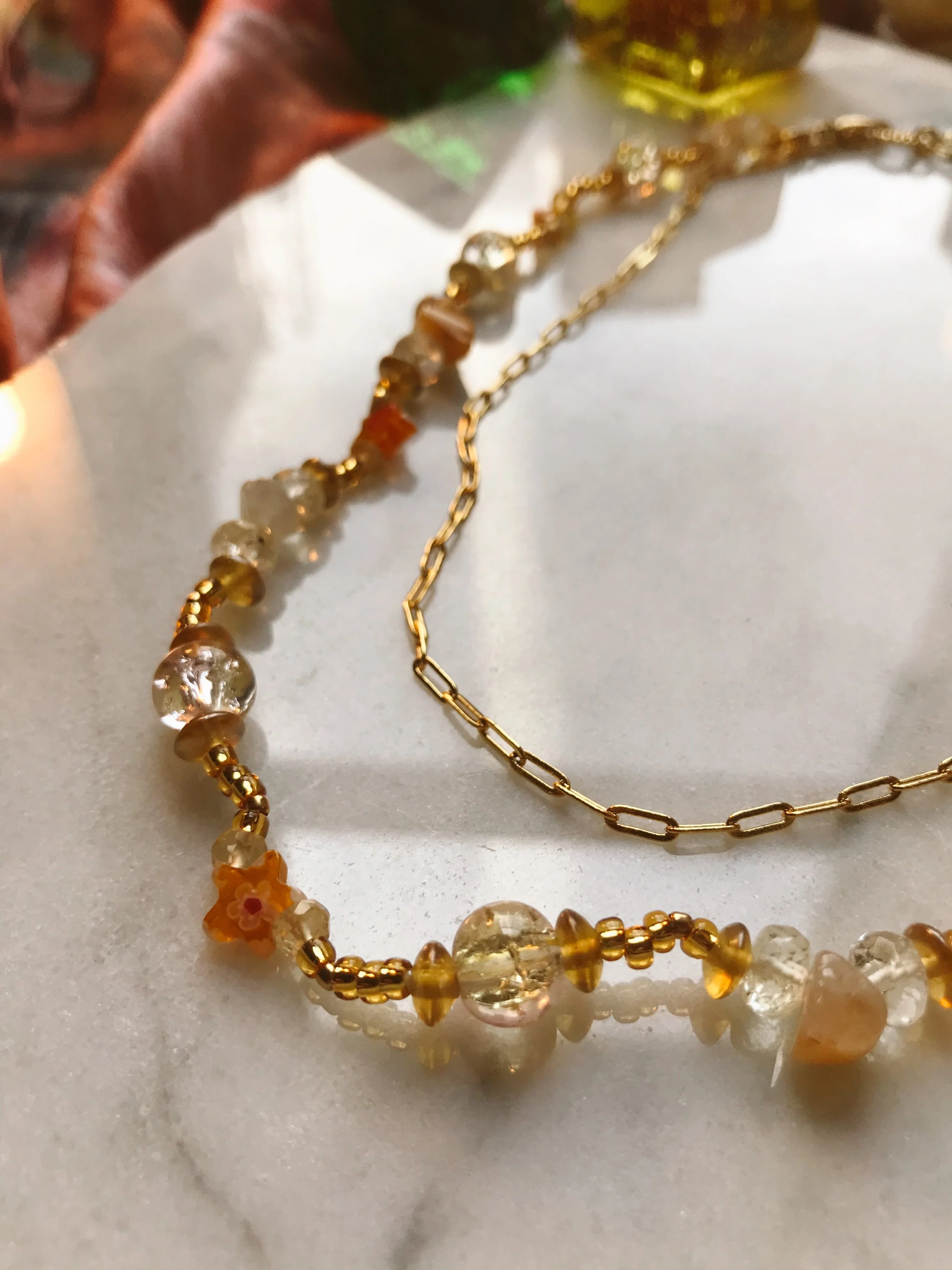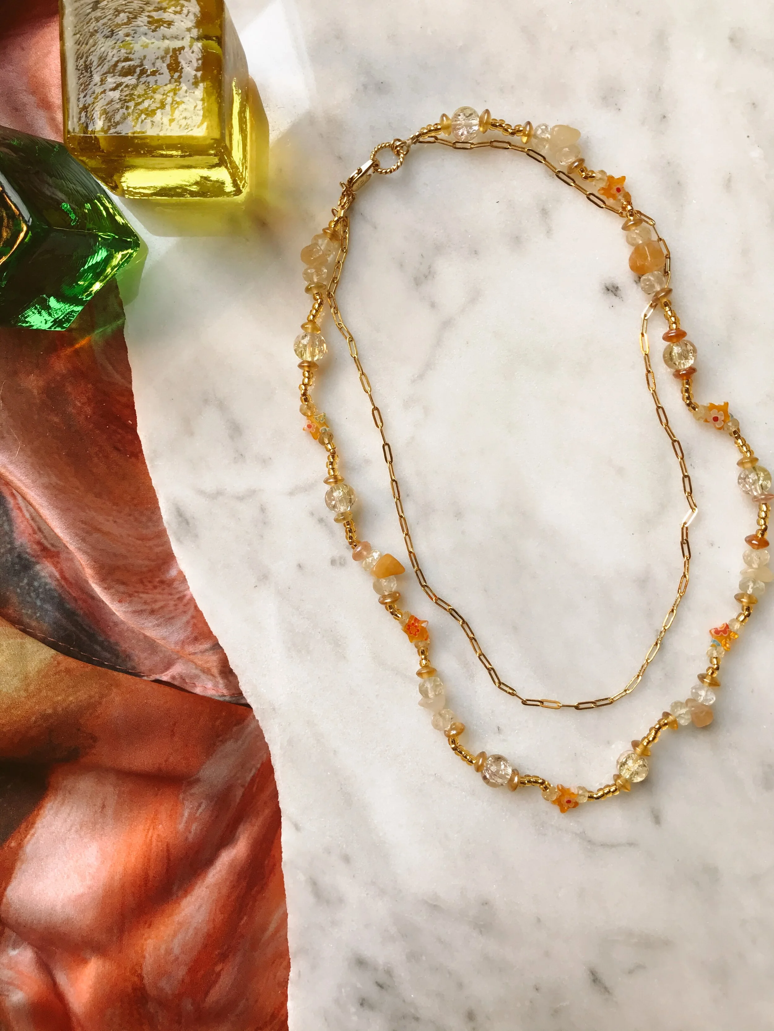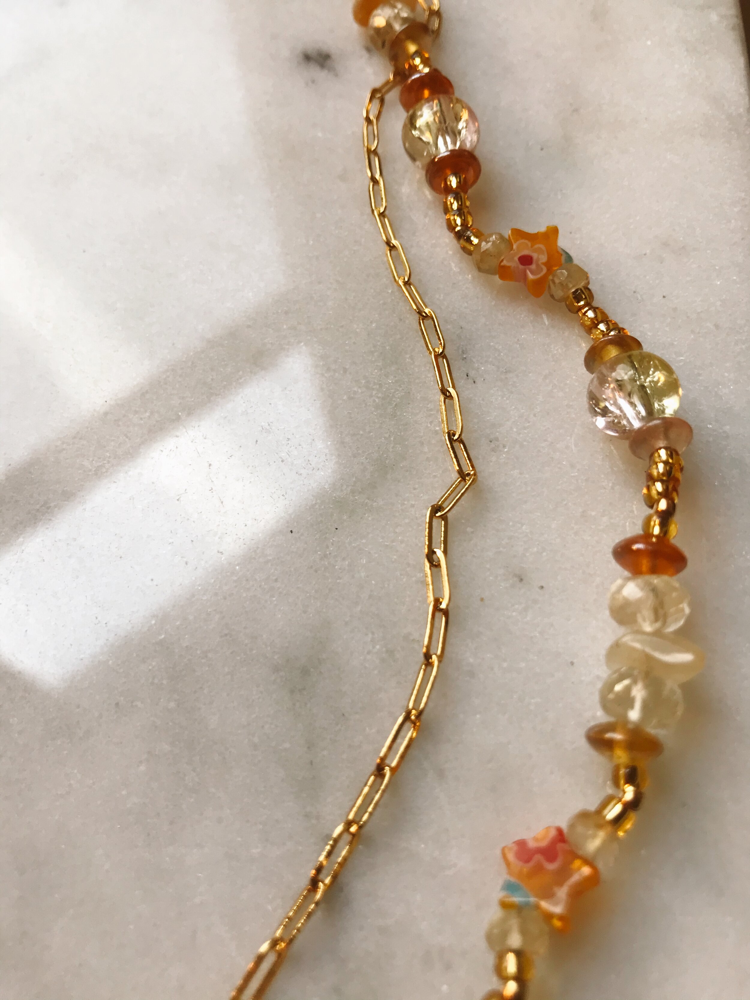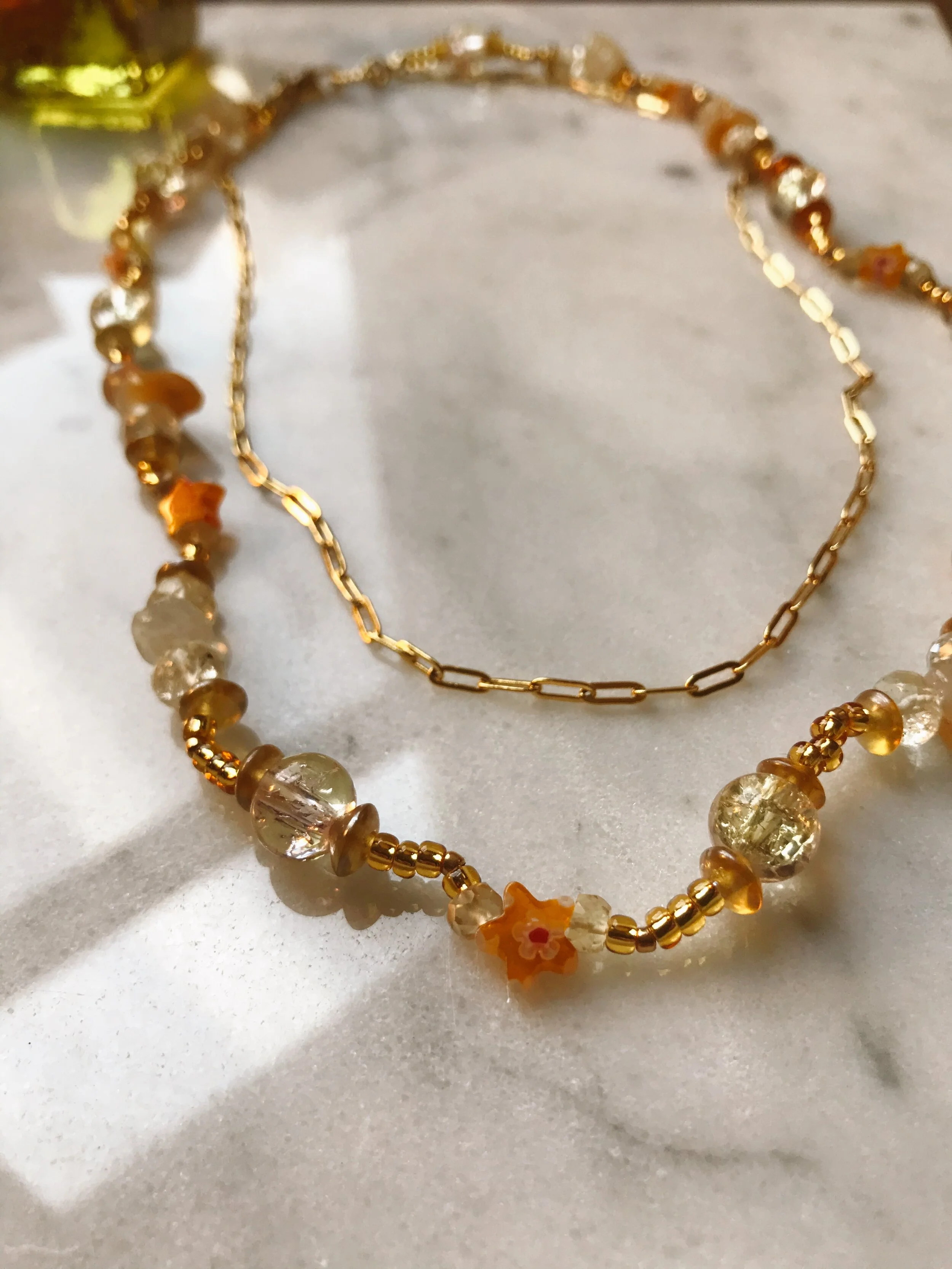 Double-stranded necklace with 24k gold-filled paperclip chain necklace, and citrine gemstone, yellow glass millefiori beads, and various glass and gold-plated accents. Small lobster class closure. Gold chain approx. 17.5” length; beaded chain approx. 19” length.