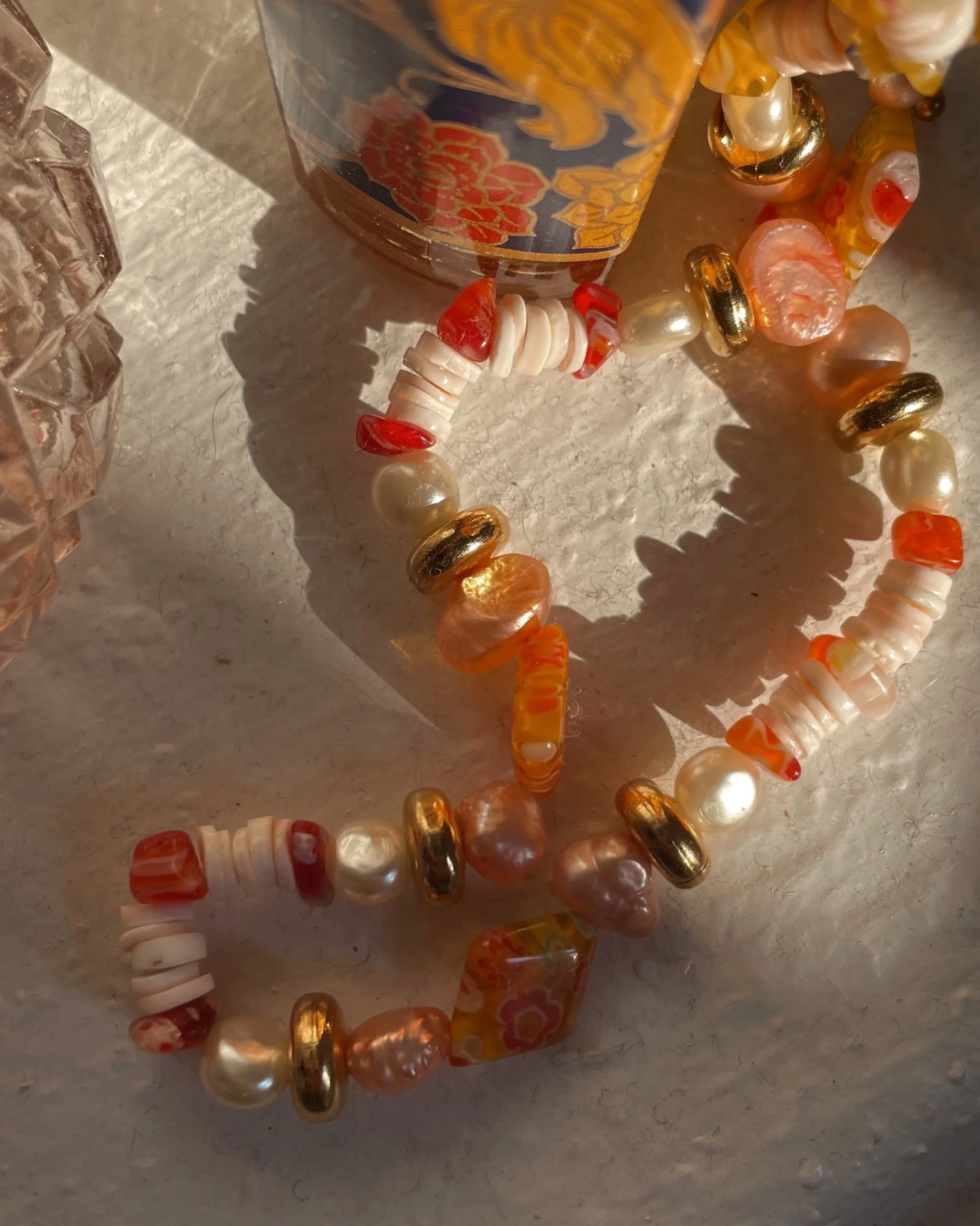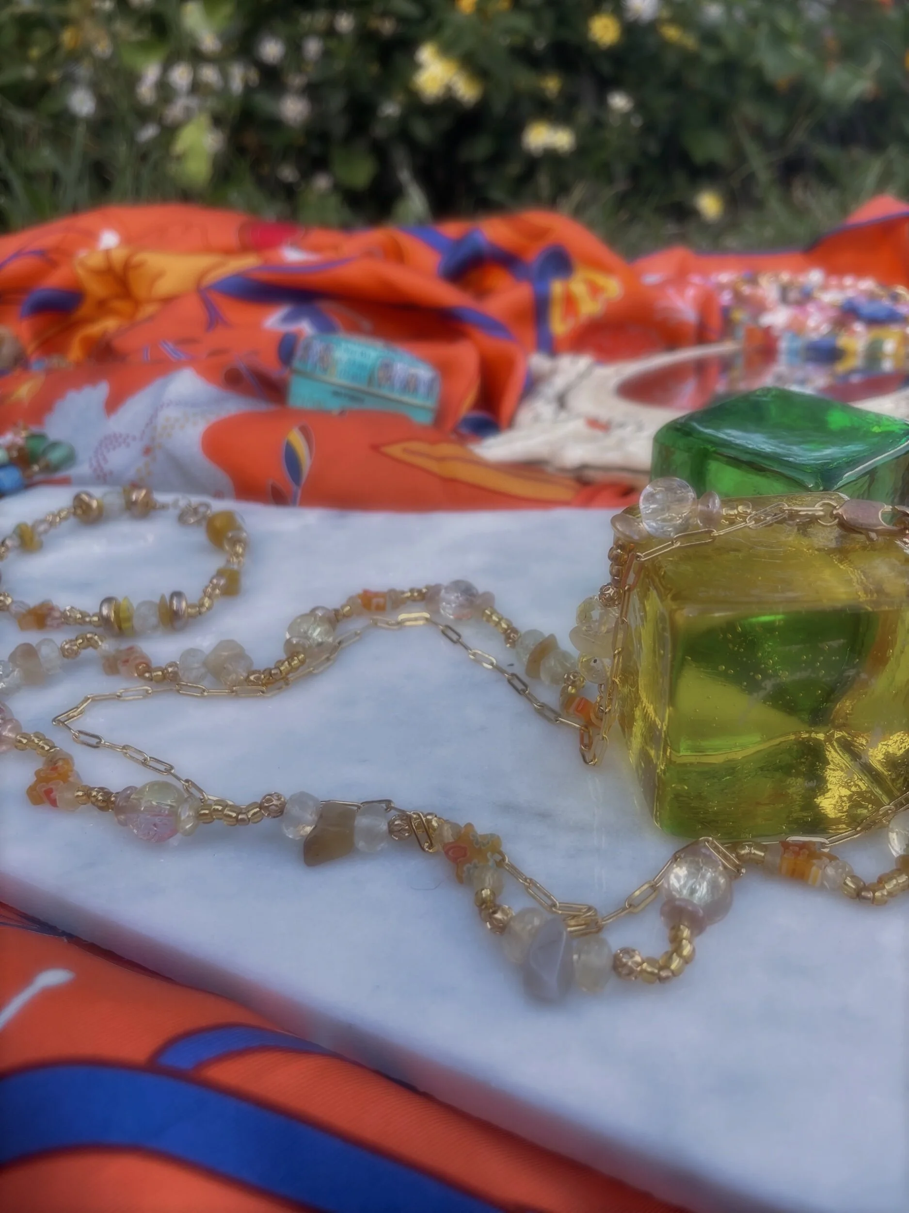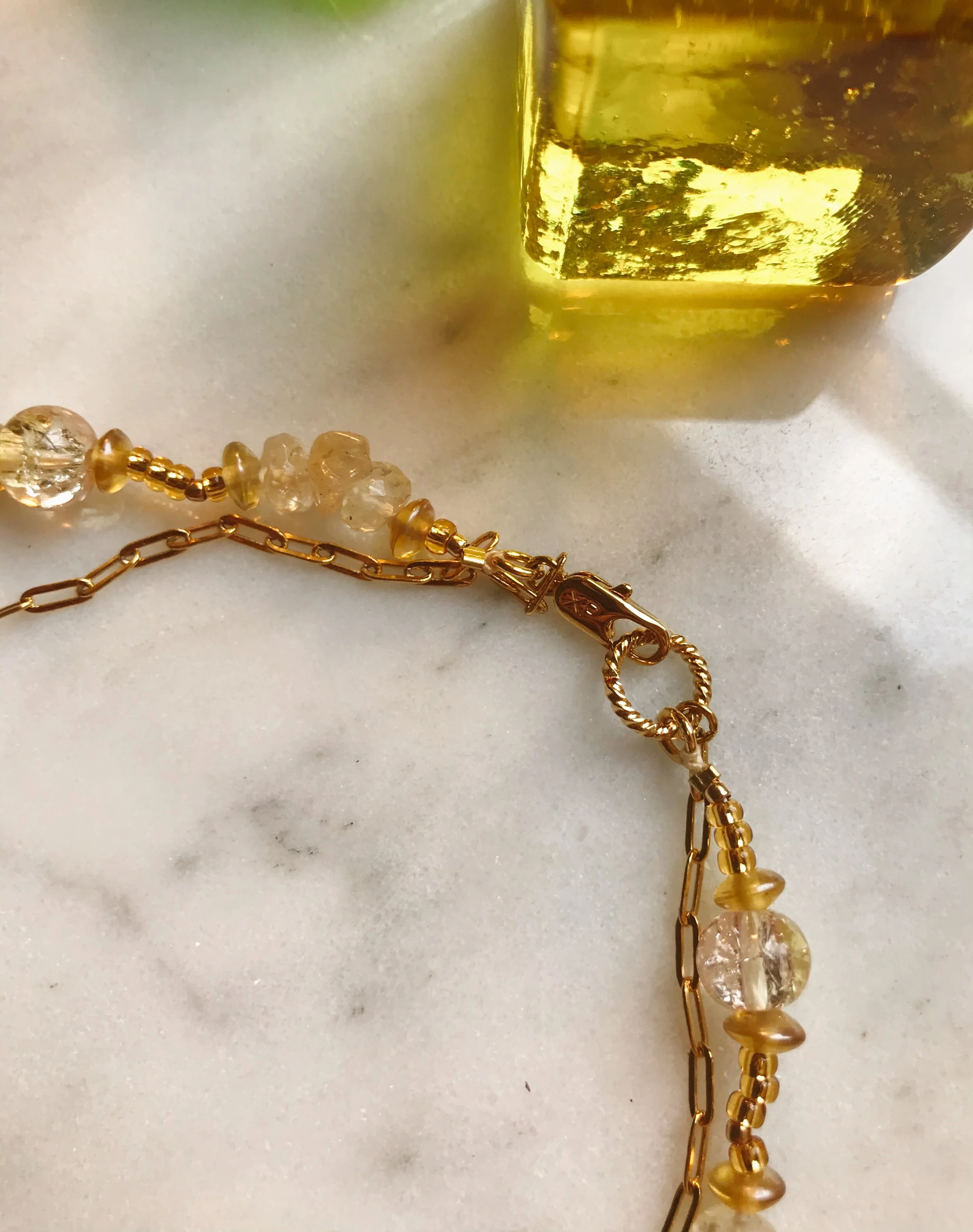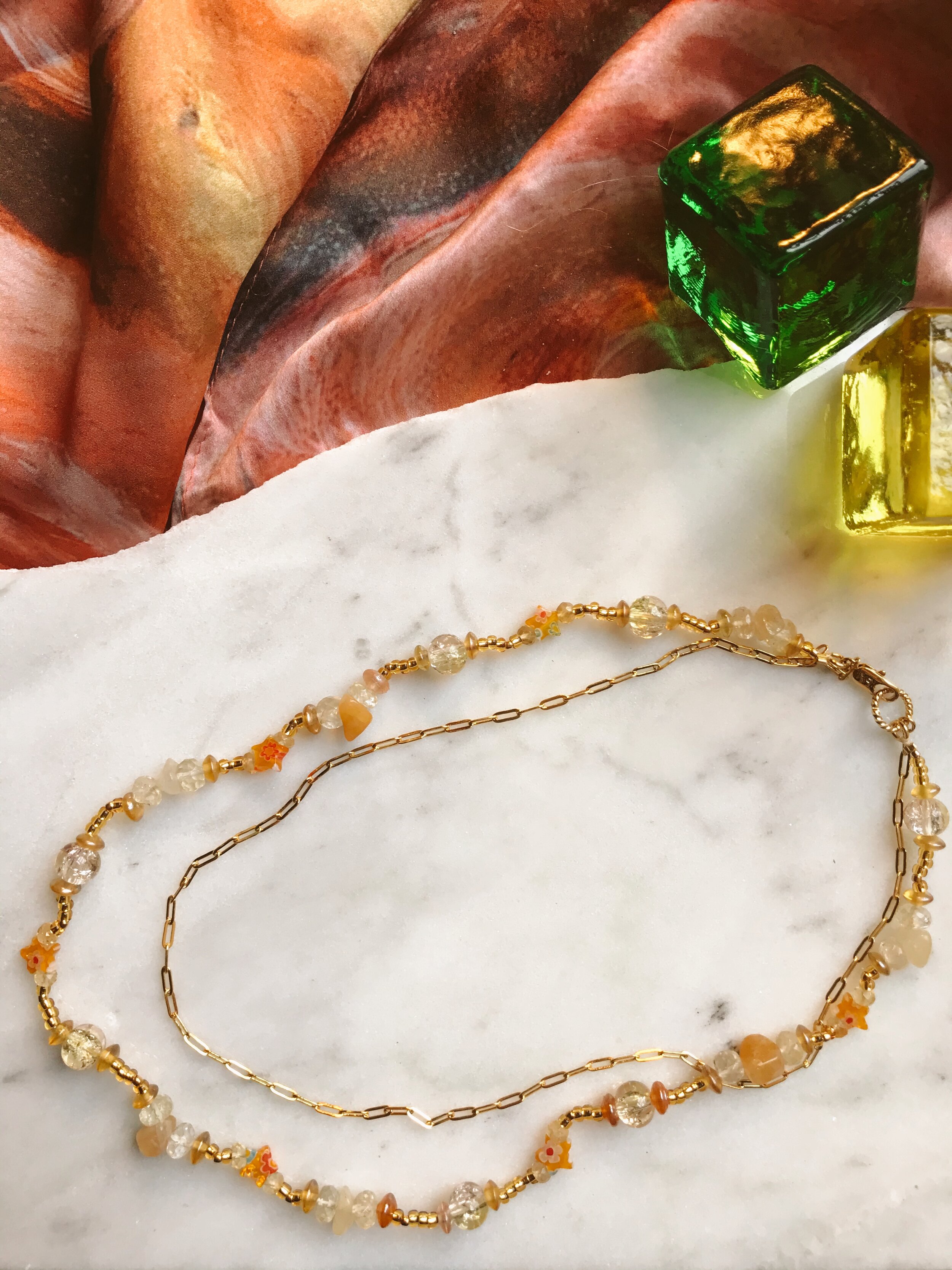 Double-stranded necklace with 24k gold-filled paperclip chain necklace, and citrine gemstone, yellow glass millefiori beads, and various glass and gold-plated accents. Small lobster class closure. Gold chain approx. 17.5” length; beaded chain approx. 19” length.