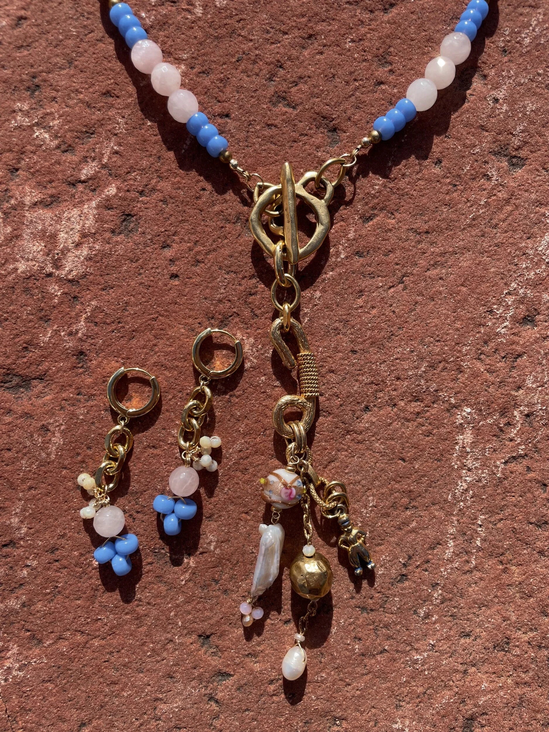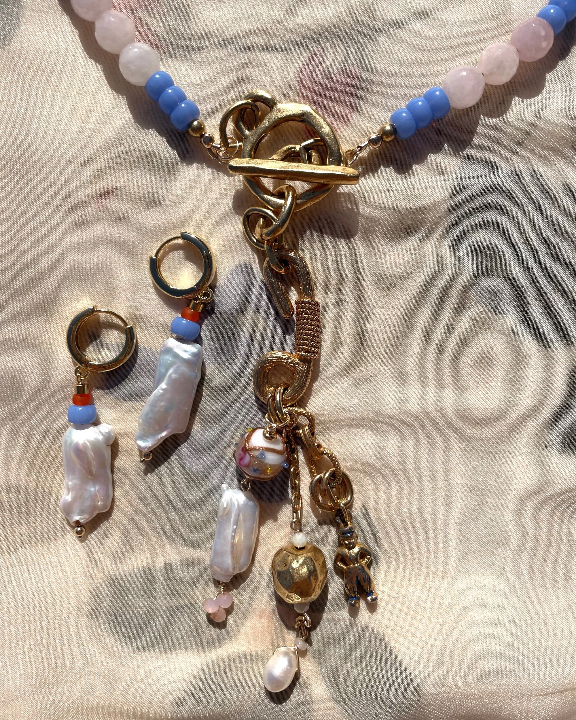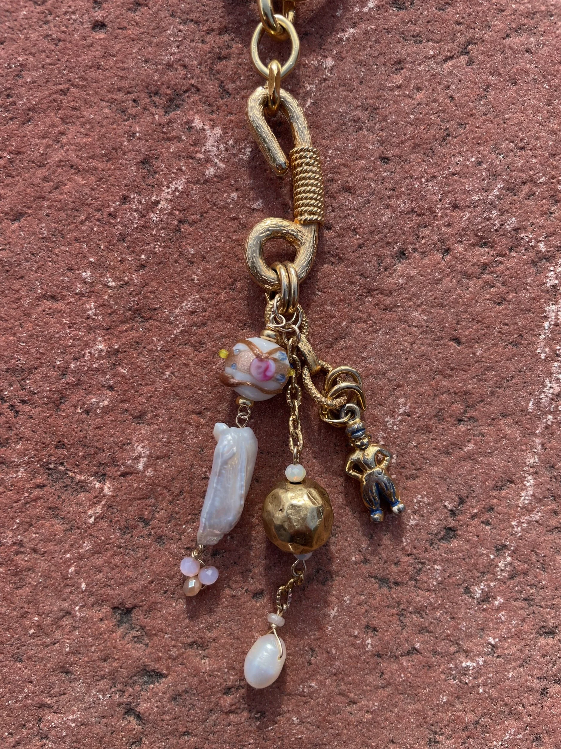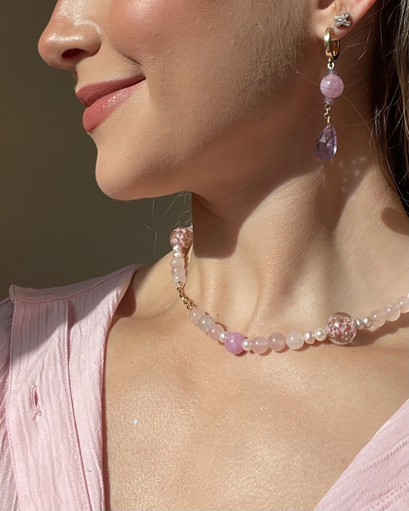 This powerful healing necklace features rose quartz gemstone beads, AAA pink freshwater pearls, and vintage floral glass beads hand-sourced in New Orleans, LA (2023), finished with a gold-filled front-facing hook clasp and AAA baroque freshwater pearl droplet and milagro charm.
