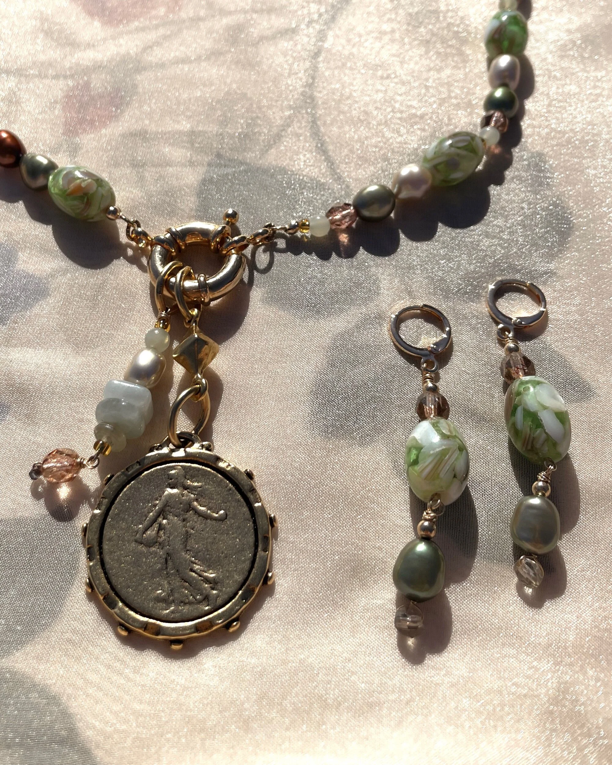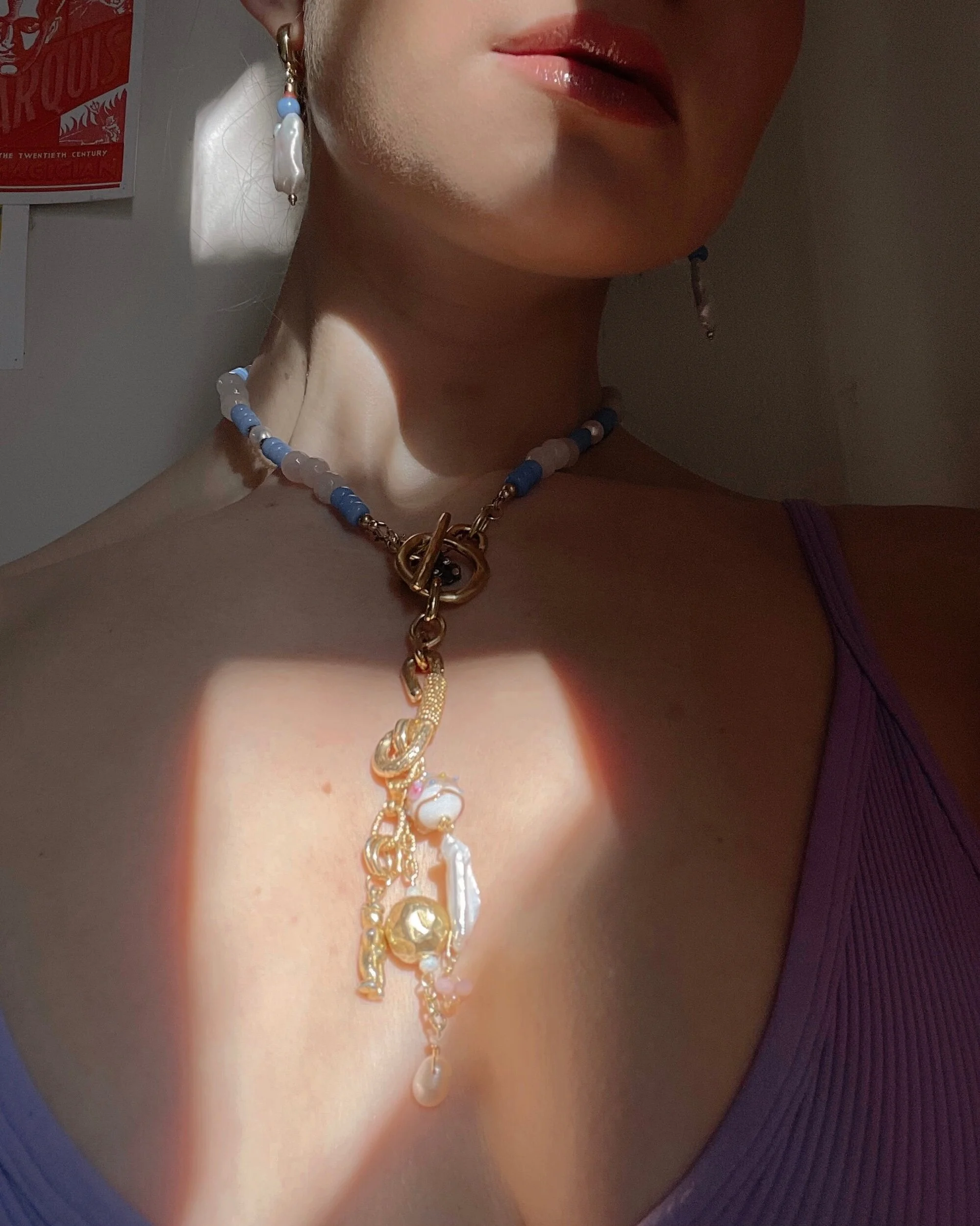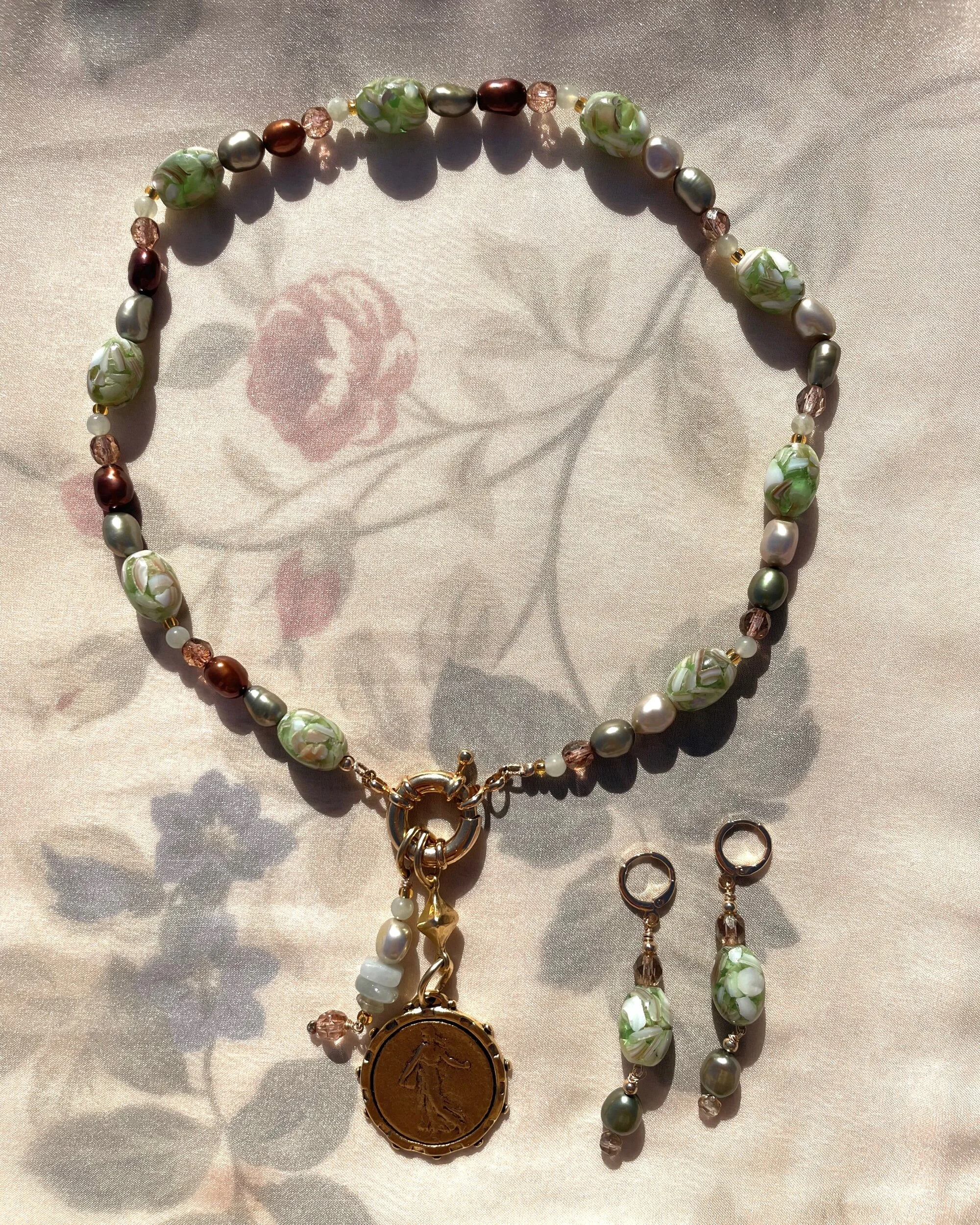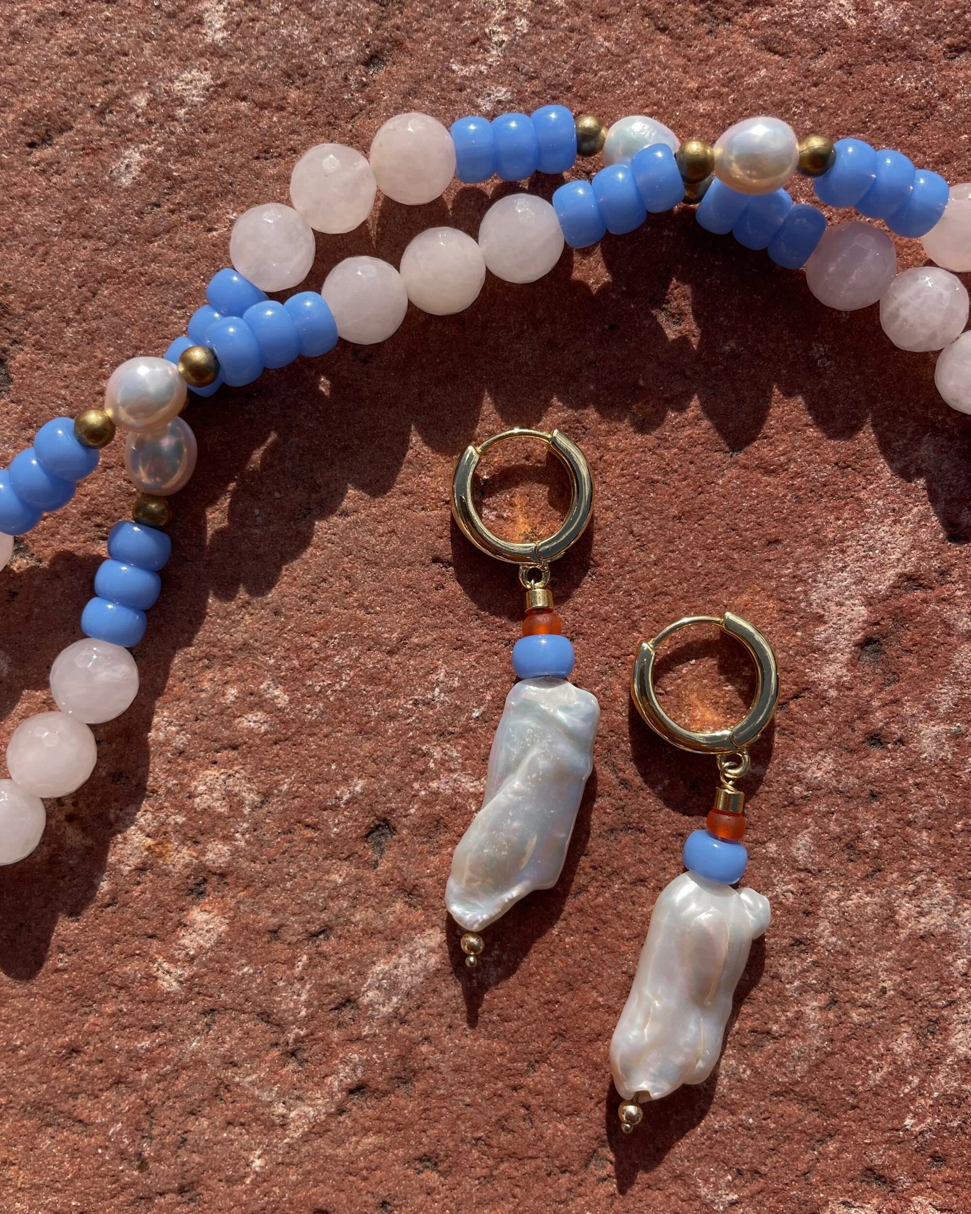 This powerful healing necklace features rose quartz gemstone beads, AAA pink freshwater pearls, and vintage floral glass beads hand-sourced in New Orleans, LA (2023), finished with a gold-filled front-facing hook clasp and AAA baroque freshwater pearl droplet and milagro charm.