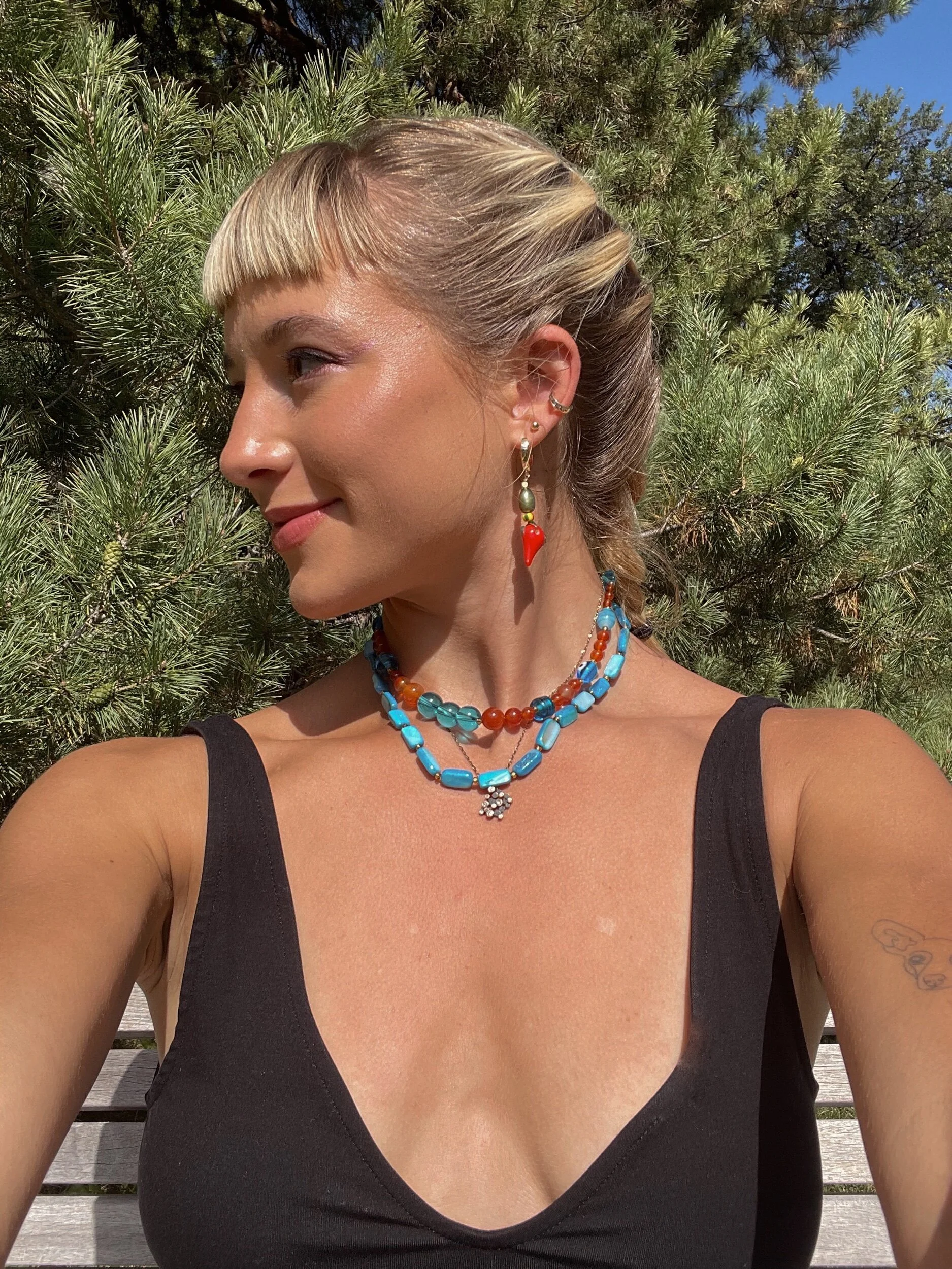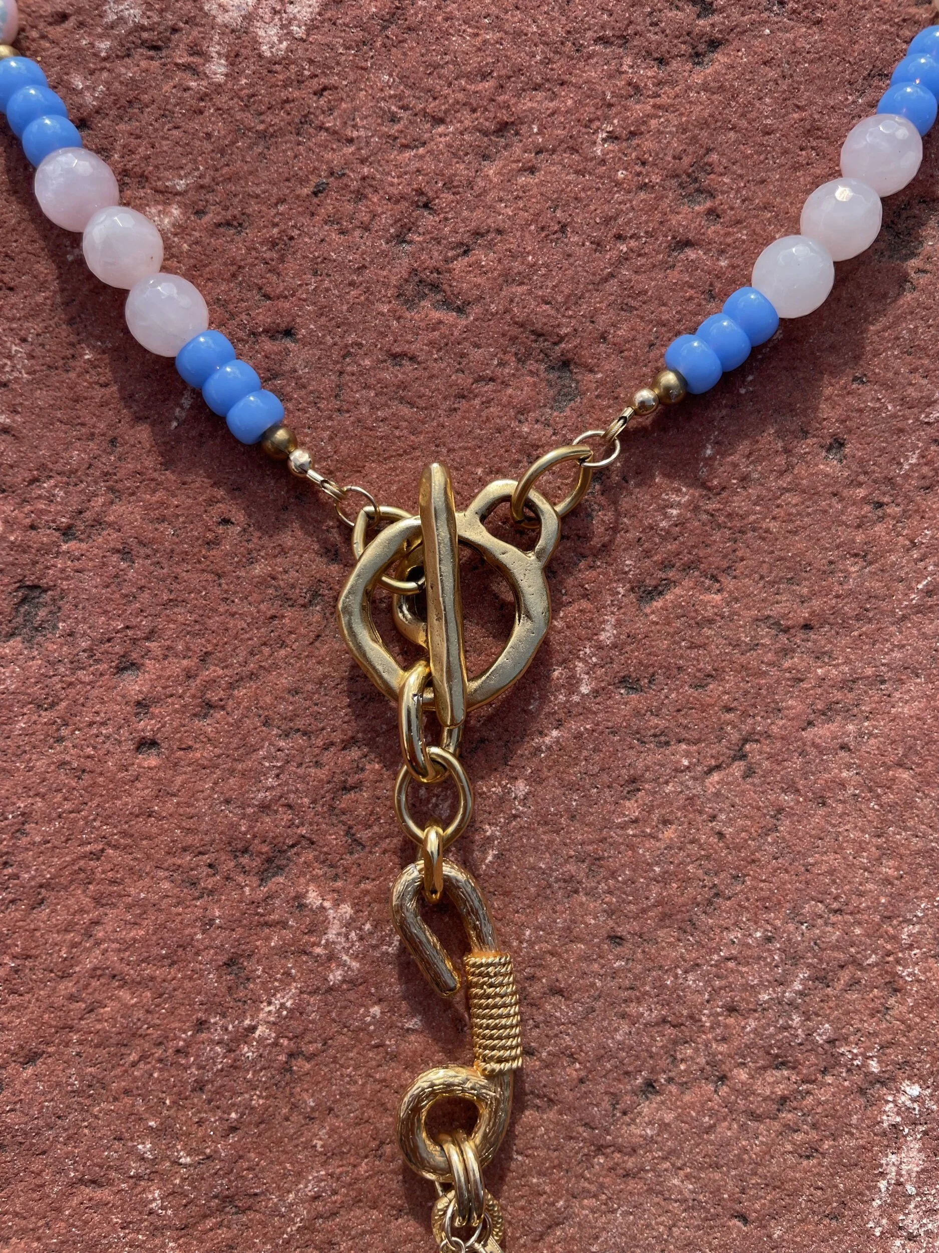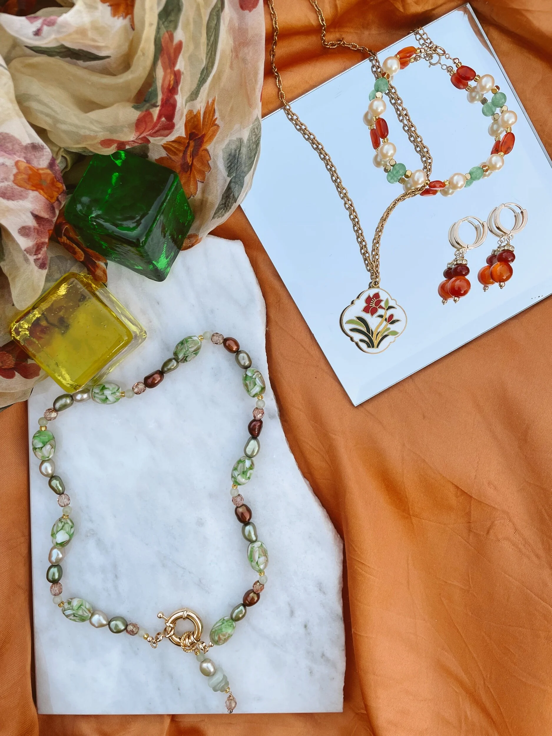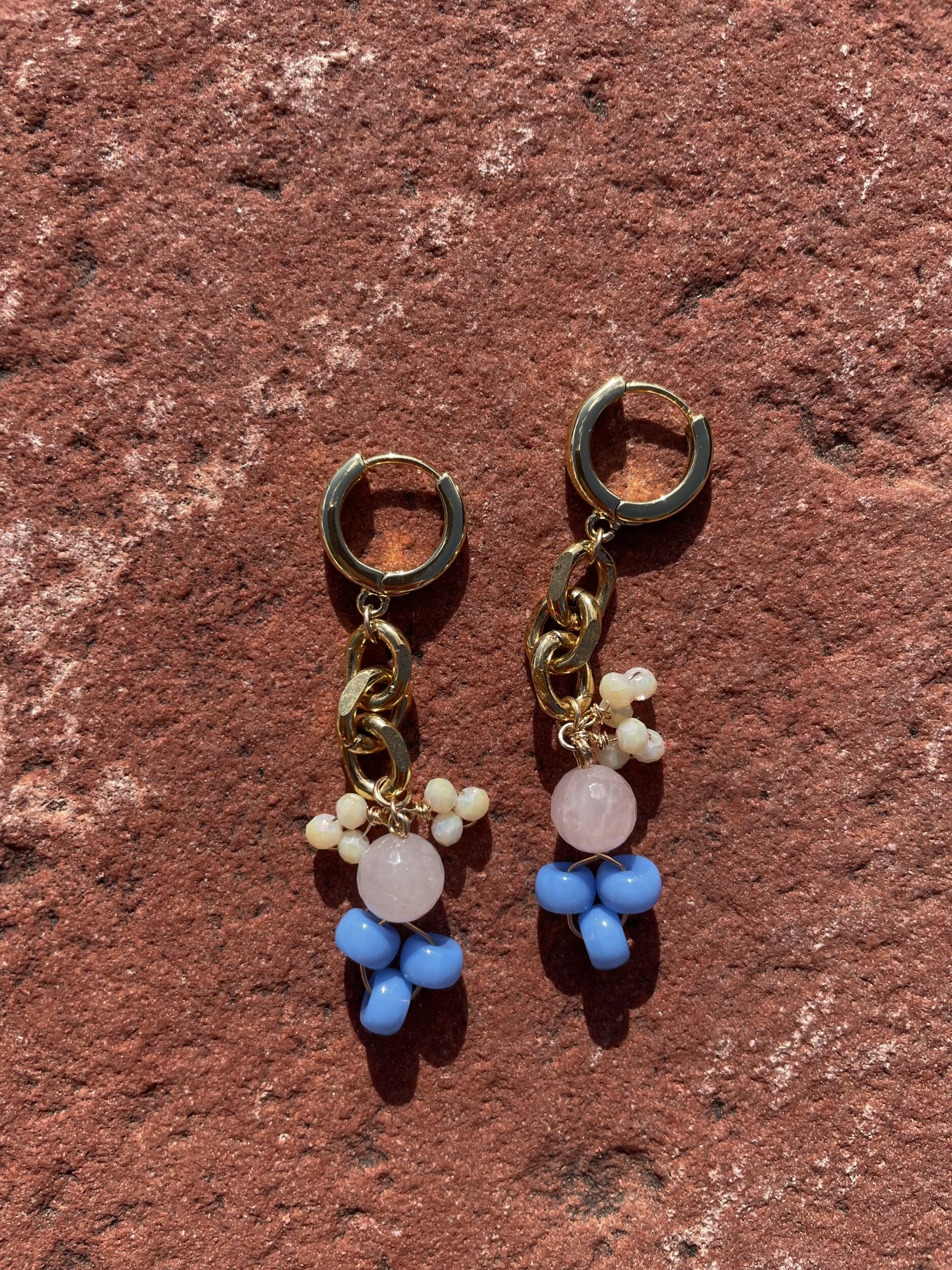 This powerful healing necklace features rose quartz gemstone beads, AAA pink freshwater pearls, and vintage floral glass beads hand-sourced in New Orleans, LA (2023), finished with a gold-filled front-facing hook clasp and AAA baroque freshwater pearl droplet and milagro charm.