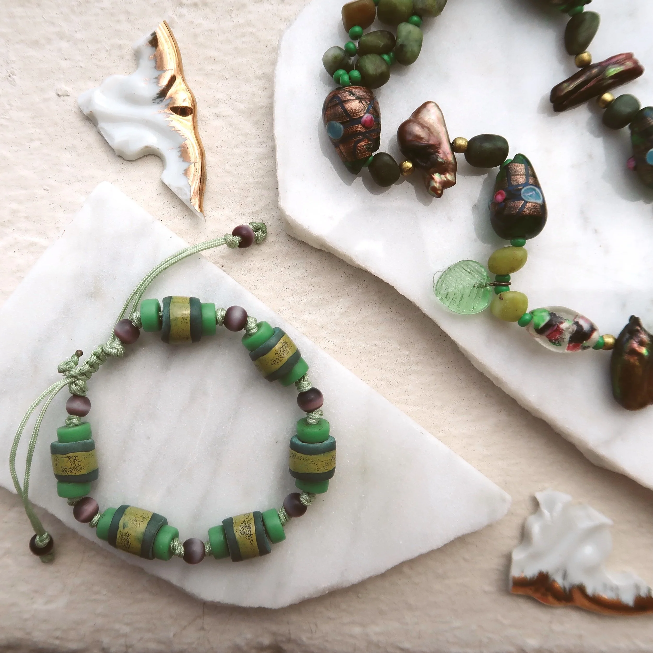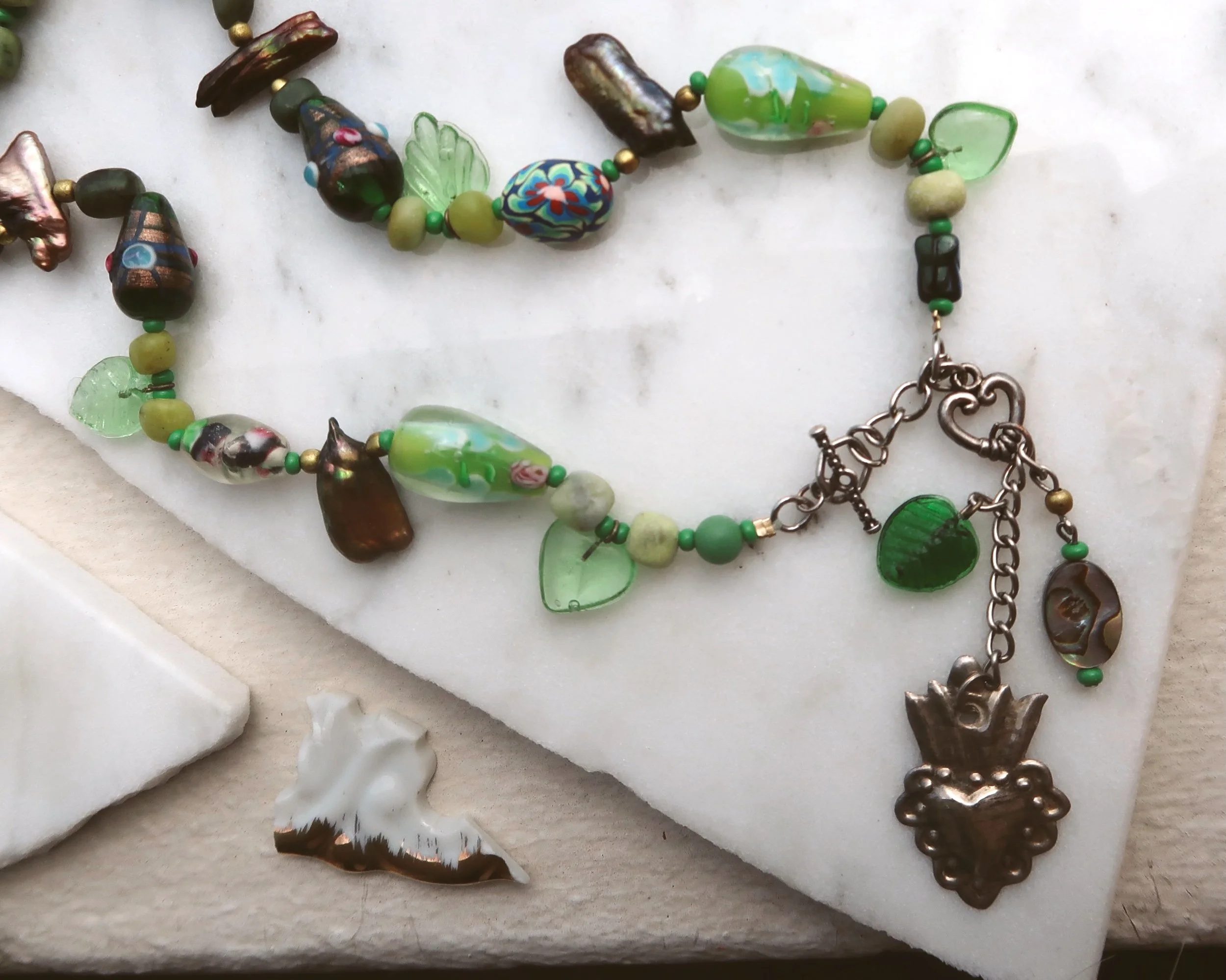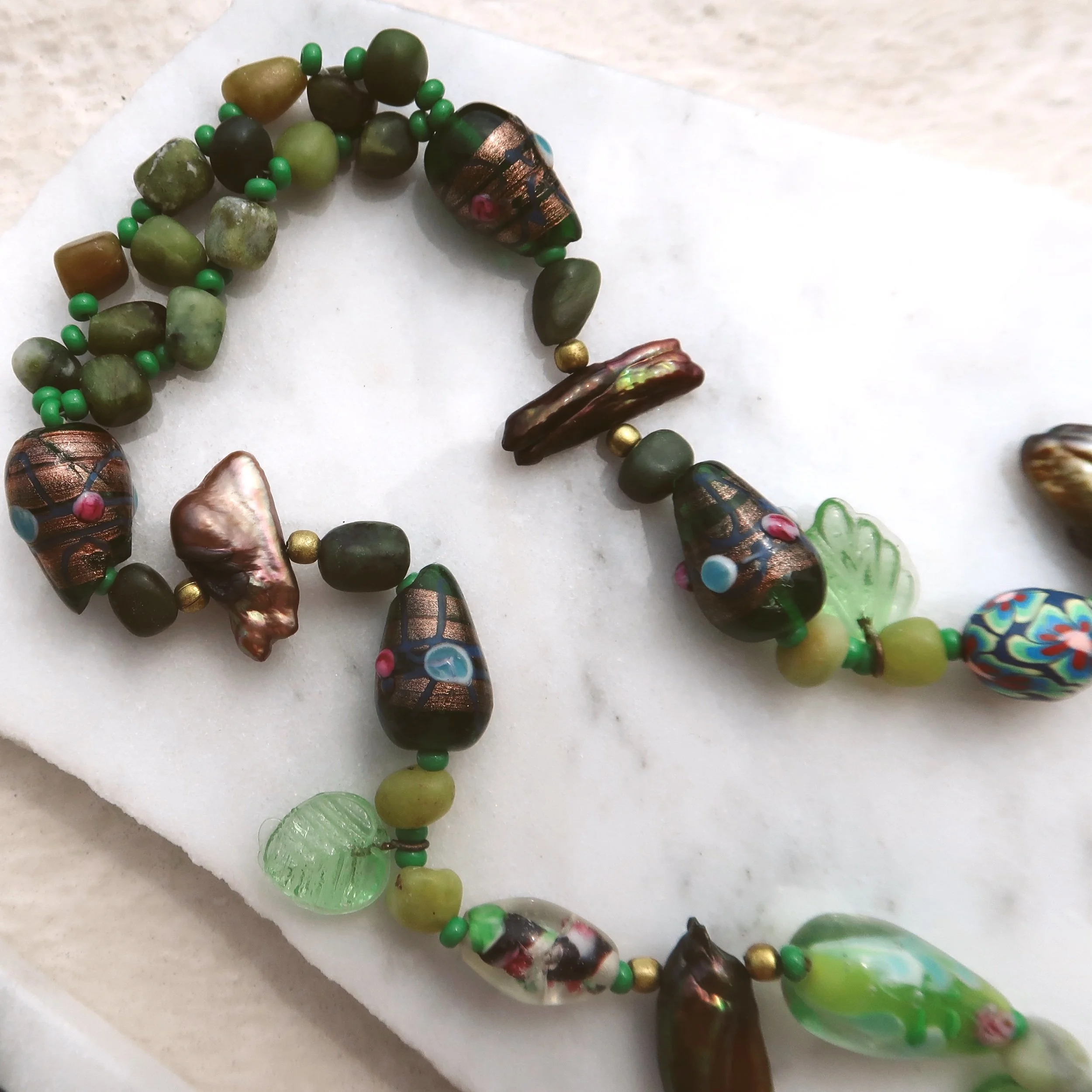 Inspired by the theme of the grapevine, symbolizing abundance, prosperity, fertility, renewal, and eternal life, this truly one-of-a-kind necklace features assorted glass beads with woven serpentine gemstone beads at the nape of the neck.
