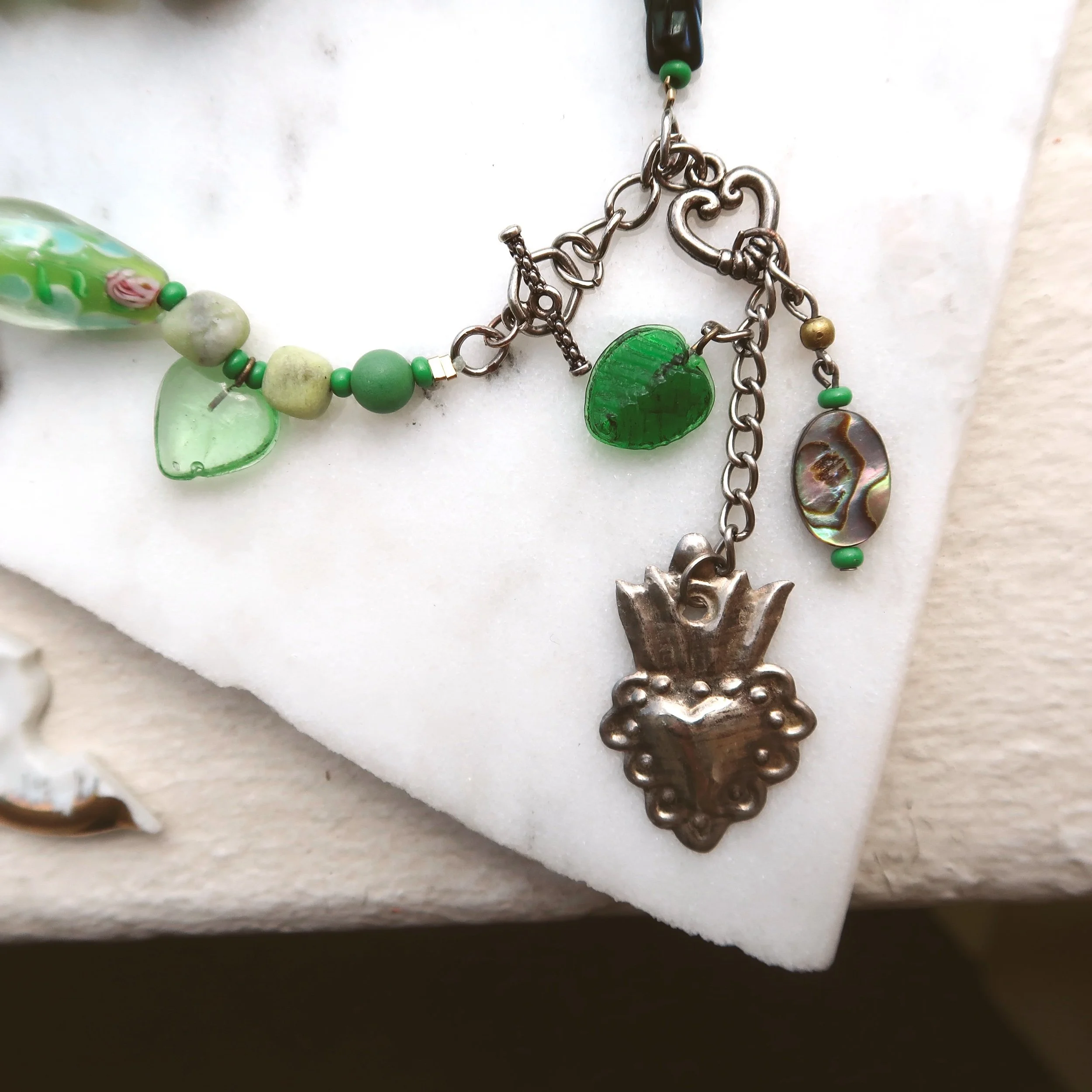 Finished with a front-facing sterling silver heart-shaped toggle clasp and beaded pendants.