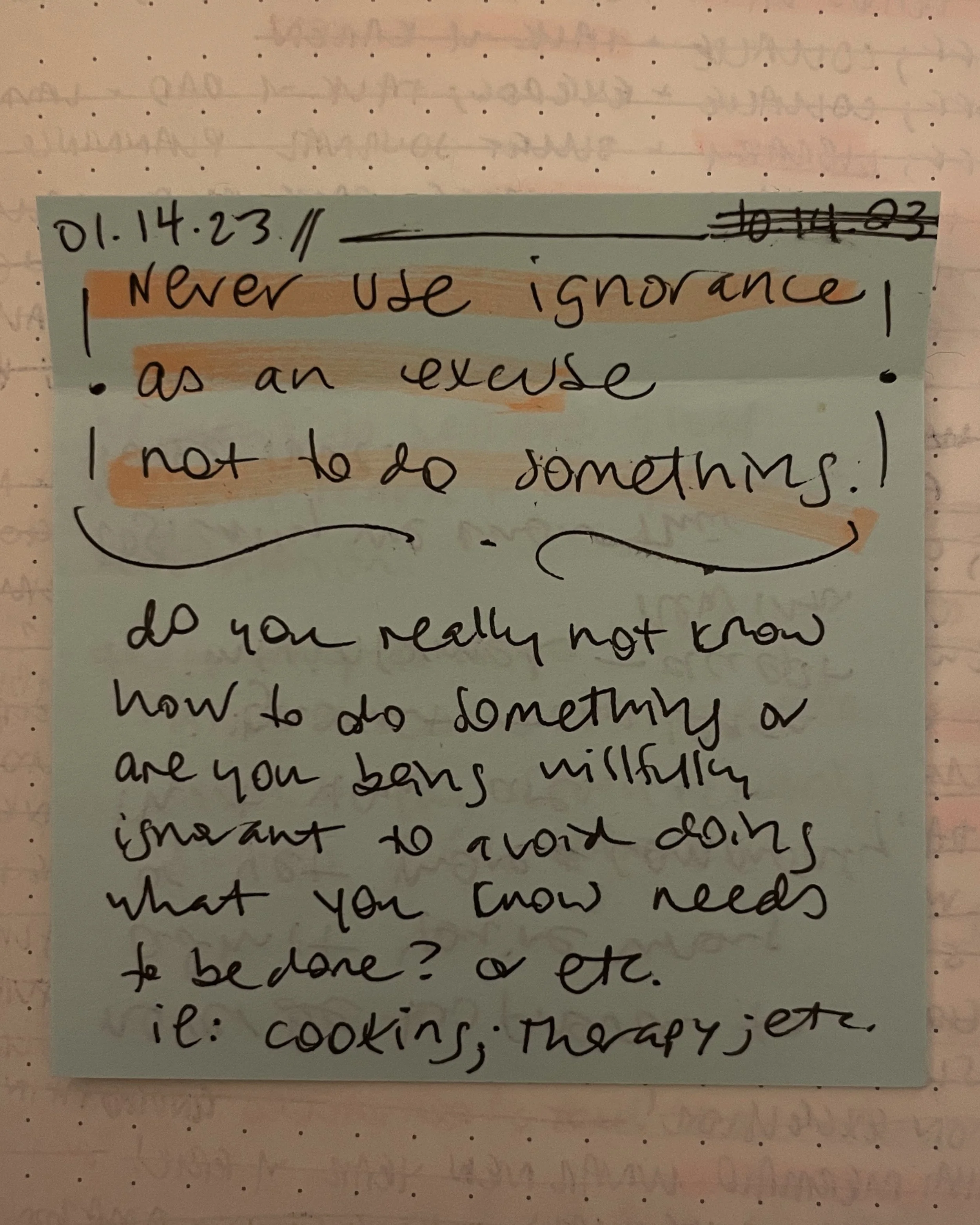 In fact, I have a sticky note to myself from January 14, 2023 that has become a sort of personal mantra for me: “Never use ignorance as an excuse not to do something!” Very pointedly underneath, I had written: “Do you really not know how to do something, or are you being willfully ignorant to avoid doing what you know needs to be done? i.e. cooking, therapy, etc.”